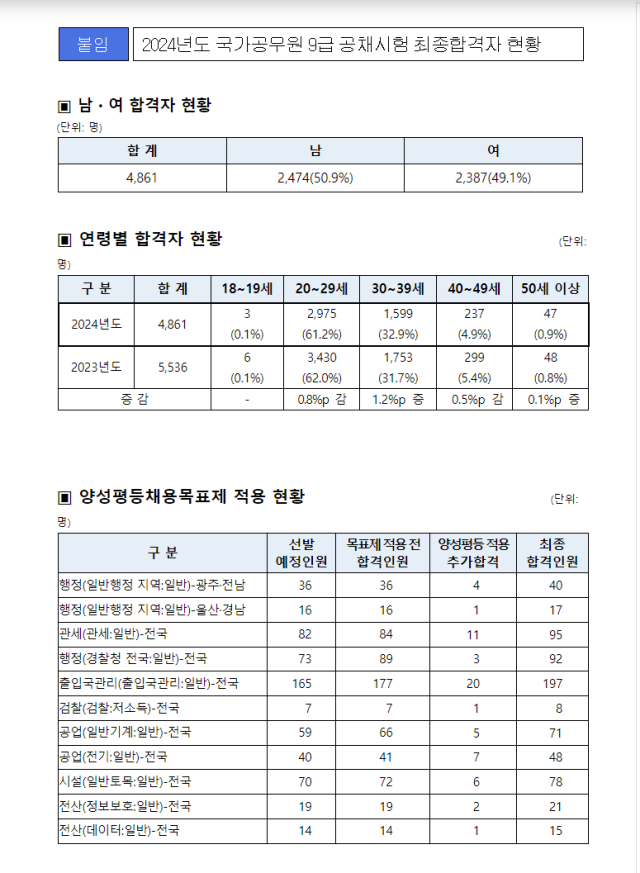 2024년도 국가공무원 9급 공개경쟁 채용시험 최종합격자가 발표됐다.